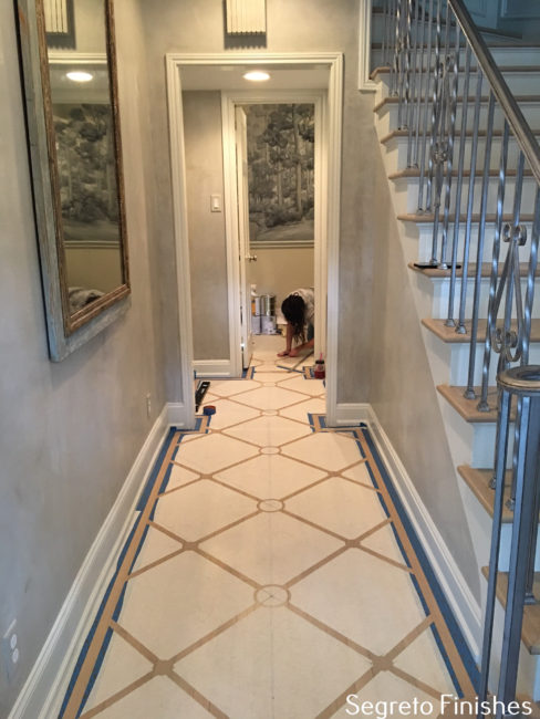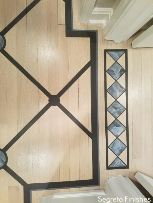 After we applied the paint and the vellum was removed, it was decided to marbelize the inset circles in a dark gray and add a diamond border at each doorway transition.