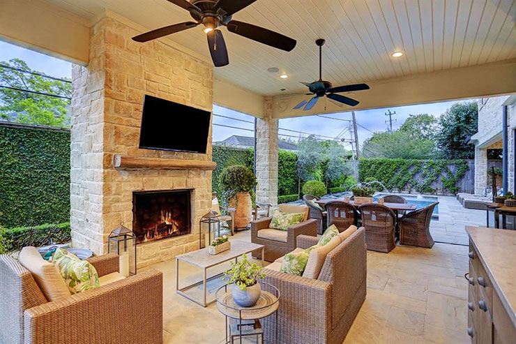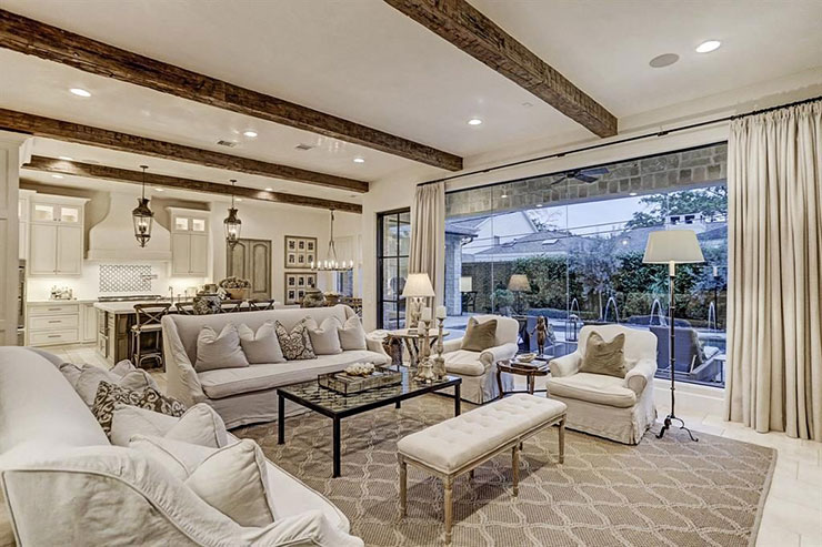With ample comfee seating for entertaining or hanging out with the fam, this room has such beautiful views to the pool making it feel twice as big!!