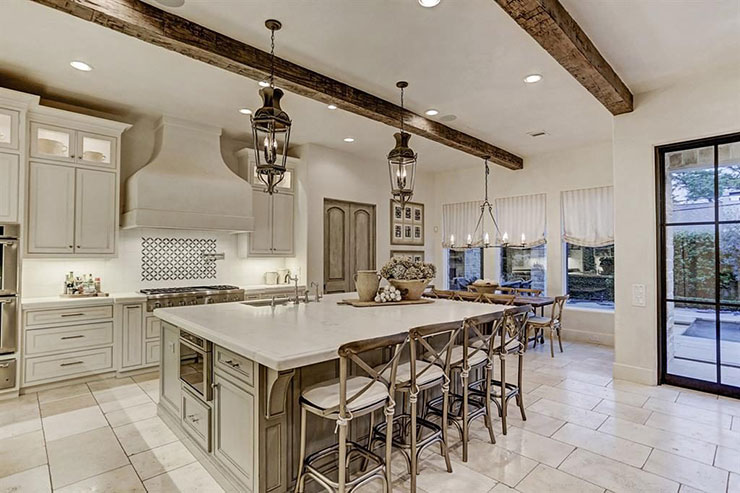 This functional kitchen has plenty of space for the whole family to pitch in or at least sit and talk to the cook while they work. The cabinets are glazed, hood plastered and doors to the mud room finished to feel reclaimed!