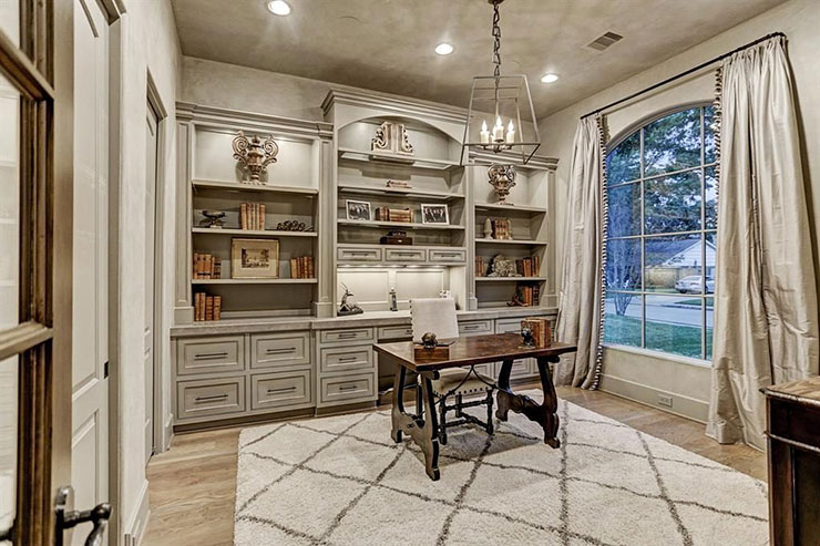 The beautiful study serves a dual purpose for both him and her. The darker tones of the plaster appeals to masculine sensibilities, while the painted cabinets and ball gown silk drapery appeals to the feminine side.