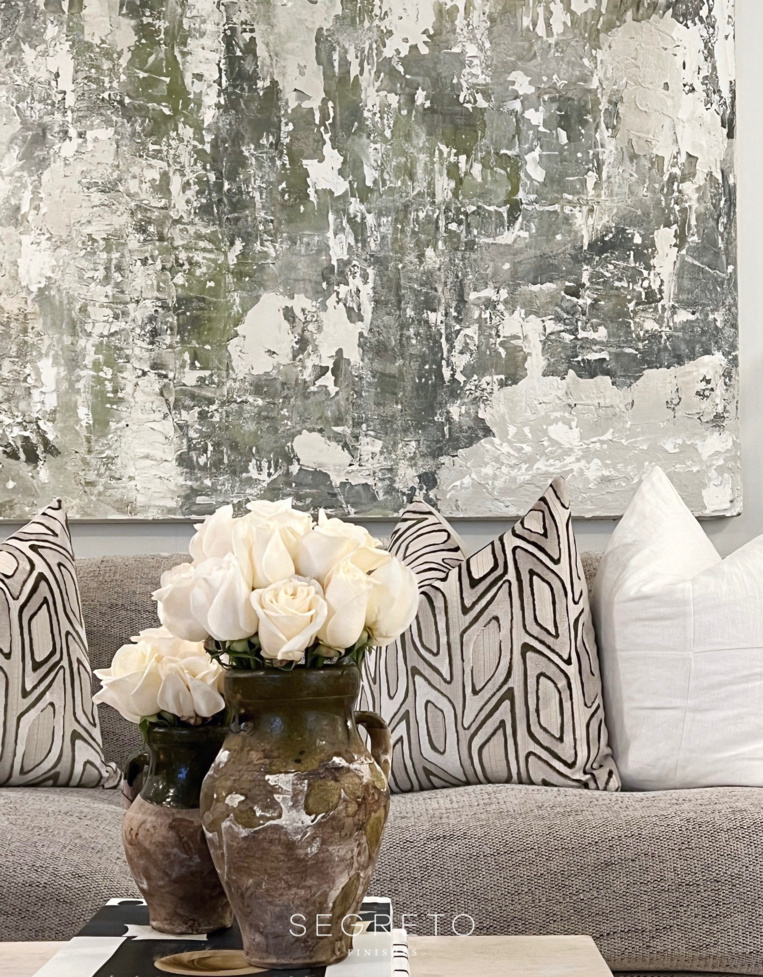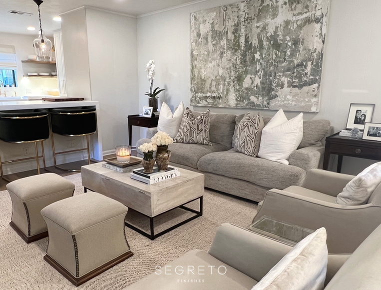 Warm and inviting with plenty of room for entertaining. What is new besides the paint and finishes? The two linen pillows from Etsy; graphic velvet pillow from MAI; and two side tables from Lam Bespoke. Kirby was even able to refinish the console and create the art piece above the couch from left over paints and plasters use in the house!