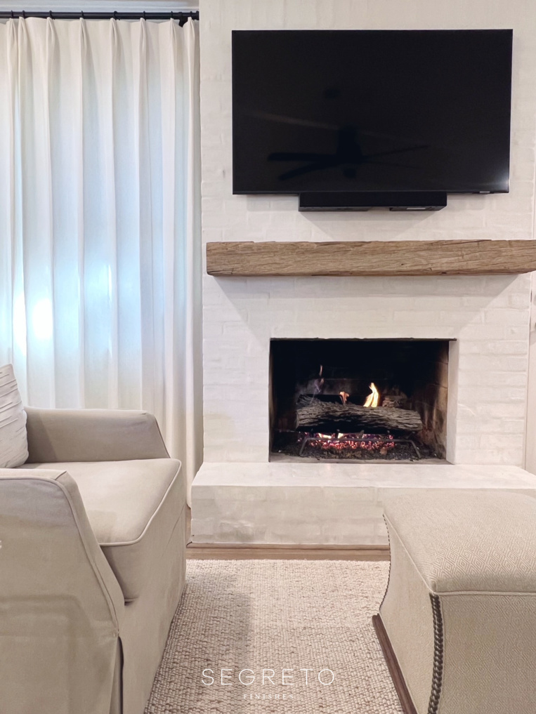 Well quite a difference! The built-in was removed, floors refinished, white traditional wood mantle replaced with a reclaimed wood beam they found at Old World Lumber Co. and the brick and ceiling plastered from the Segreto Palette in Moonbeam. The art above the console are Segreto art pieces made from plaster and hung on the wall.
