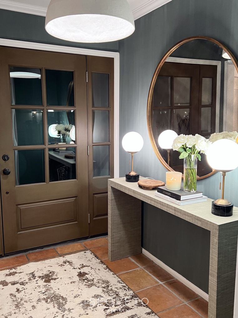 After our photoshoot she felt the entry was not exactly the way she wanted it to look. On a budget she made the console piece out of wood and wrapped it with a grass cloth. DYI instructions to come!! The mirror was one from Sammy and Dylan’s home that they couldn’t use. Boy it sure looks perfectly here!!