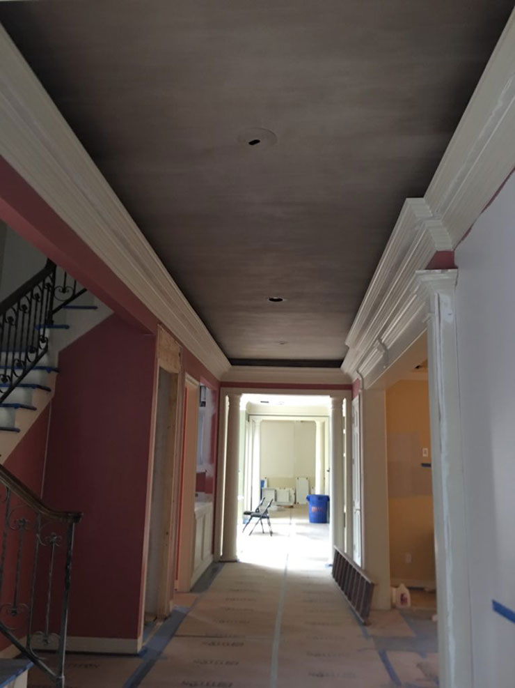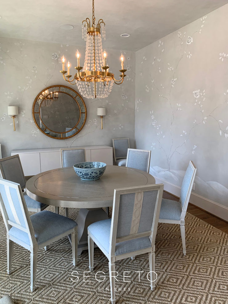 This dining room, in one of Kirby’s client’s homes for Designer Shannon Crain, took a major turn with the wall finish.  We plastered it in the most soothing tone of blue gray and hand painted a tone on tone mural giving life and interest to the shape!! Don’t worry you will see better pics in Book 4!!