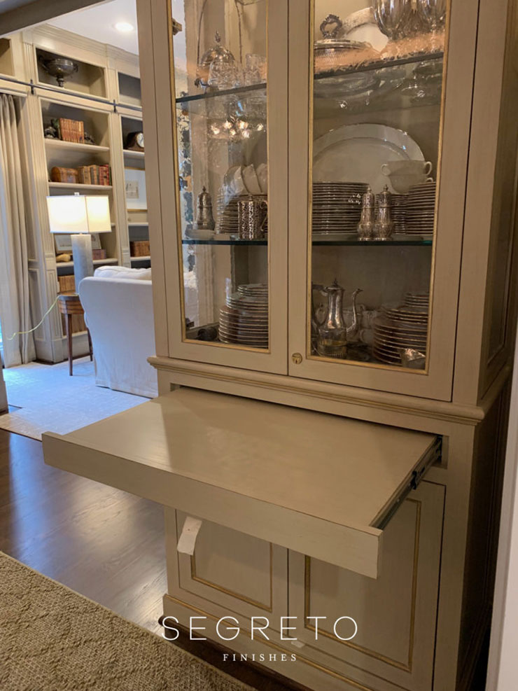 In the dining room Gunn Construction and Building crafted two China cabinets.  I love this pull out!  It works so well as serving when she is hosting a dinner party!