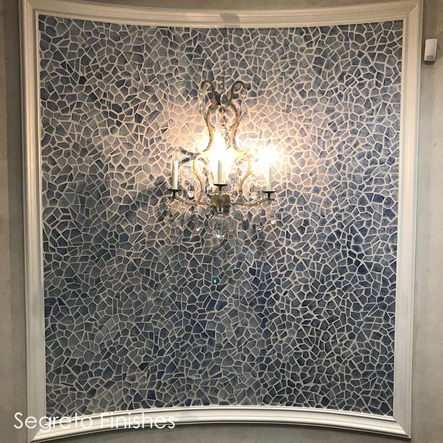 This is a fun project for Designer Richard Coleman! He applied the grass cloth wall covering to an inset niche in an entryway.  Starting with the fabrics he wanted to emulate the design of the velvet onto the grass cloth wallcovering using the blues of the patterned fabric.  Starting with the lighter tones on the right is was decide to use our painted blue sample on the left.