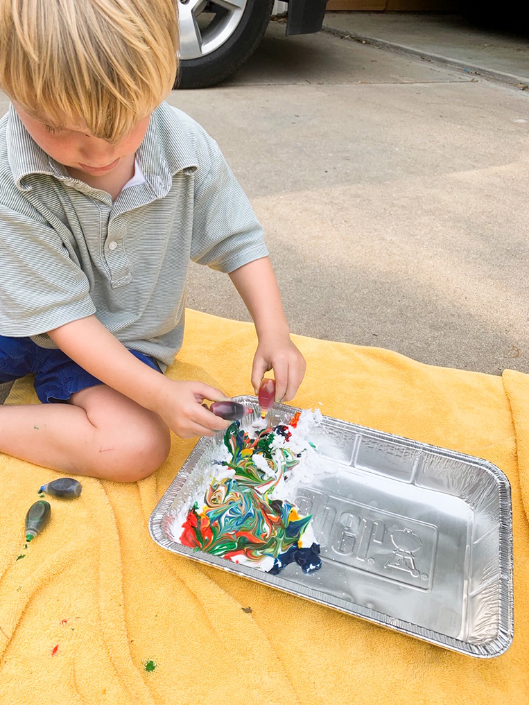 Use your stir stick to create the marbled effect then place your paper on top. Press it into the shaving cream.