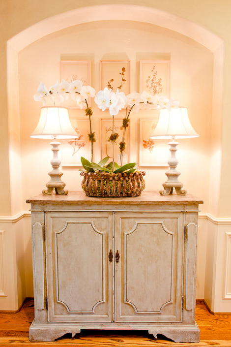 For inspiration, Elizabeth and Amy, the two sisters that comprise Munger Interiors, turned to the Charles Faudree’s style that the homeowners love. By changing some of the color tones in fabrics, finishes and furnishings from room to room, they managed to eliminate some of the heaviness that existed in the architecture. The formerly cream-colored entrance didn’t evoke the warm elegance that the homeowners hoped guests would feel. “While the fabrics and accessories played a big part in the overall goal,” Elizabeth noted, “the plastered walls were the game changer.” Plastering the walls brought an overall glow and depth that you can’t accomplish with plain paint. They feel luminous no matter the time of day, and the room always looks candlelit. The antique chair and sconces balance the newer furnishings in the home and create interest.