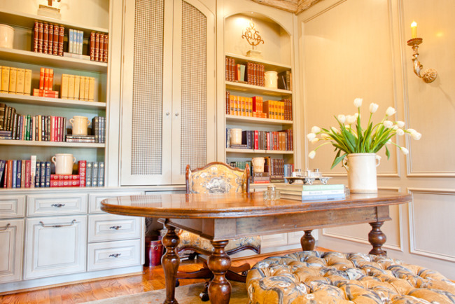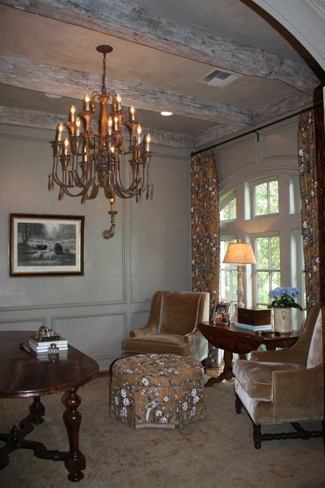 The walls were fully paneled, and the existing bookcases were antiqued, increasing their character and patina. The addition of the reclaimed beams from Custom Floors Unlimited and the plastered ceiling furthered that old world charm. I always love a classic silk velvet like the one by Schumacher used on these study chairs. Rich and soft to the touch – it’s the perfect combination for a shared office space. The camel tones of the Pierre Frey fabric used on the ottoman, draperies and desk chair appealed to the husband while the softness evoked from the worn, antiqued look and the bird pattern was a favorite of the wife’s. The light fixture and 18th century wine tasting table from the Gray Door are fabulous.