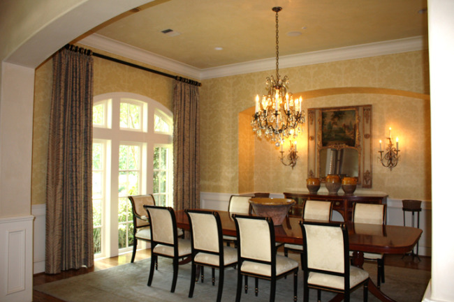 The introduction of the sconces, confit pots and 18th century trumeau mirror in the dining room again brings in that country French flair while the addition of a smooth, porcelain plaster finish on the ceiling adds warmth and romance to the previously flat white painted ceiling.