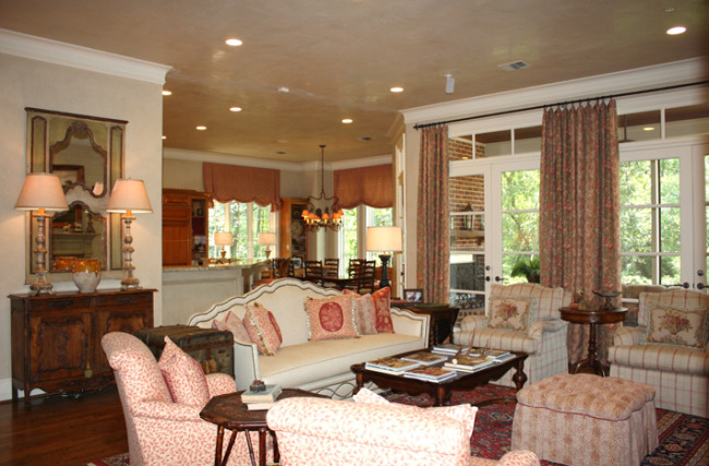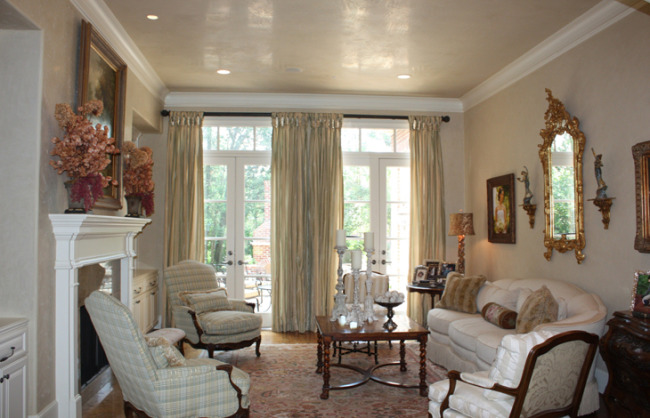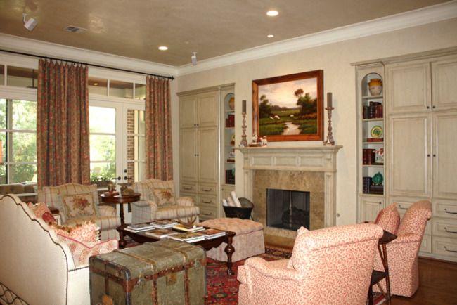 In the living room, only a few key antique and country French accessories and lamps were blended in with existing pieces—the plaster was the major change!