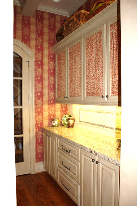Once the homeowners realized what a big impact the finish had in the den, they added the same finish on all the beams and molding in the bar. I love the fabric behind the chicken wire that adds another layer to the space within the same country French feel.