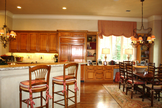 This family room stays true to the same philosophy of the rest of the home’s design – they tried to reduce the number of heavy pieces and keep the furnishings that didn’t weight the room down. Just a few dark wood pieces and a lot of the beautiful French confit, Majolica and silver collections. To freshen up the reds and greens that the homeowners love, the Mungers added wheat tones to the family room area and eliminated the heavy greens and brown leathers. By integrating some existing fabrics, they were able to maintain consistency while still bringing in plaids and small prints to create interest. To differentiate between the den, bar and kitchen area, a distressed, textured finish over the fruitwood colored cabinets allowed for a lighter look.