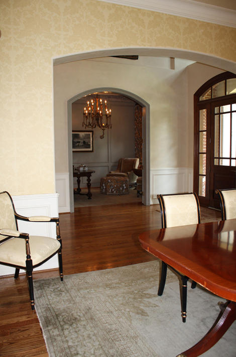 The homeowners wanted to keep the damask wallpaper, chairs and table in the dining room, so the Mungers found a way to tie in these older pieces with the other rooms. The gray-blue rug from Carol Piper Rugs and new draperies balance the updated, French blue-toned study across the entrance.