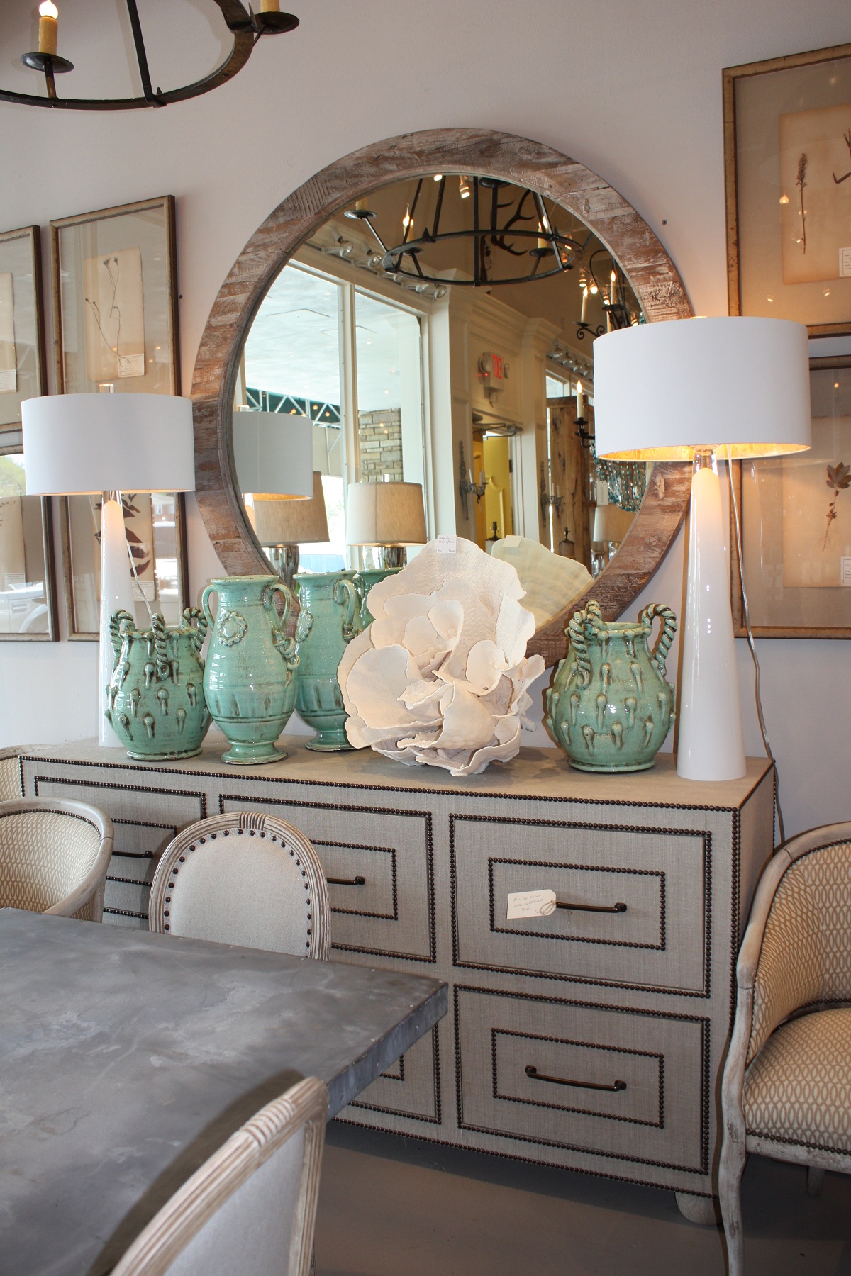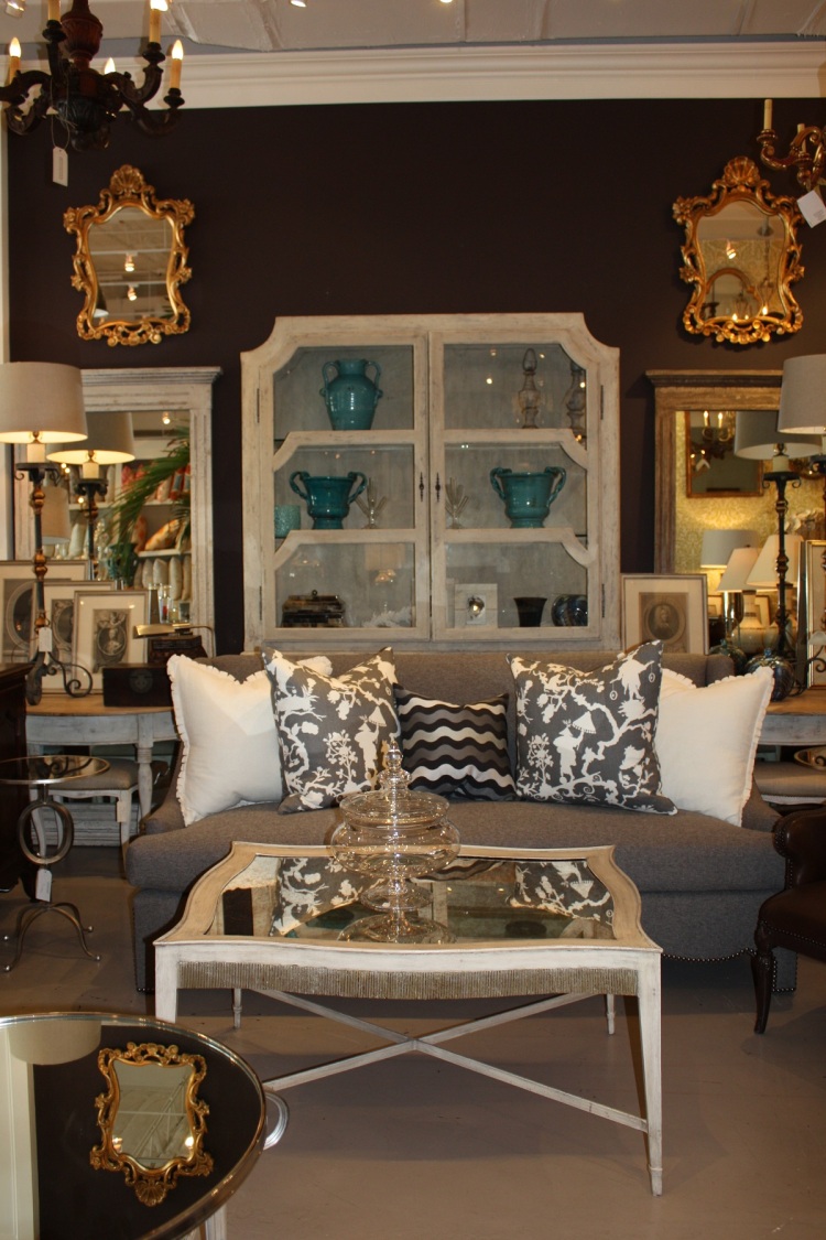 Another beautiful look in front of the Farrow & Ball wall painted Pigeon.  The whole display could be moved into my home as is!!! I’m redoing my kitchen and den right now, so I found Boxwood to be a wonderful place to get ideas and find unique items that lend a home its finishing touches.  Bret, being a designer himself, is both designer-friendly and able to help individual customers coming in purchase those hard to find items to complete their home.