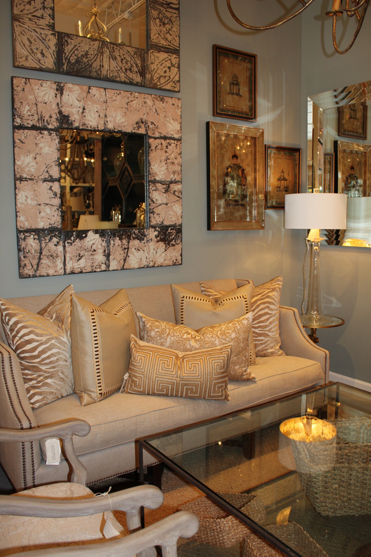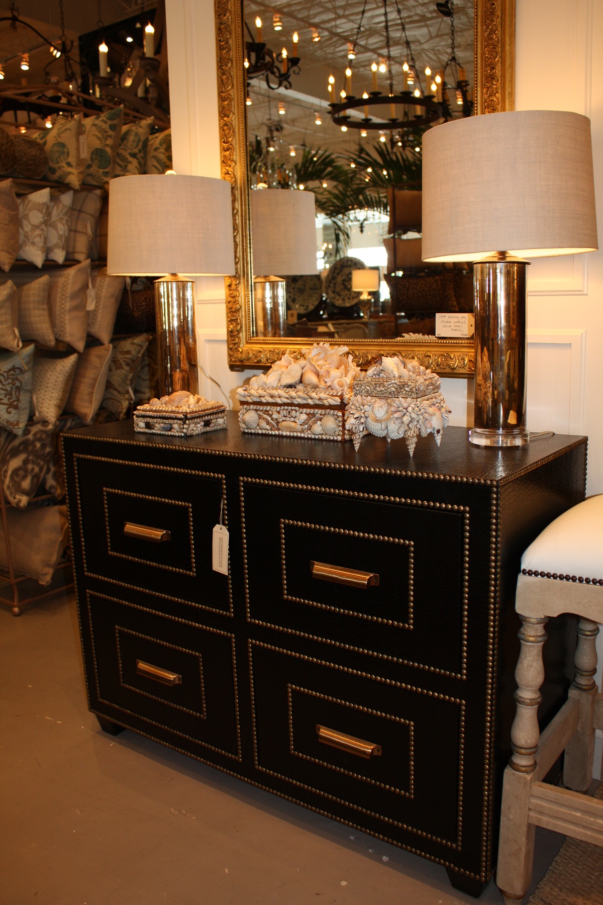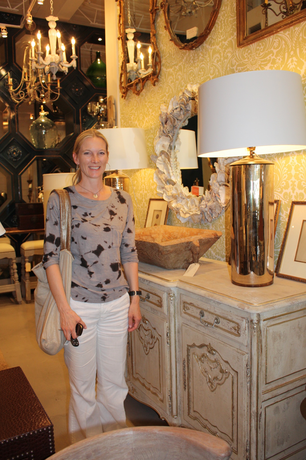 Spotting a client of mine, Mary Kay, in the store, I noticed her affinity for unique lamps. Boxwood has their own lighting creations.  So many of the light fixtures are made custom at the store, such as their signature mercury glass lamps that Mary Kay seems to be drawn to.  “We love, love, love lighting!” says Mimi, “Chandeliers – old, new, vintage and everything in between.”  With a wide array of pole, silvered, clear glass and custom painted balustrades made into lamps, they certainly have a wide selection.  Boxwood also has an array of sconces from Europe and believes one can never have too much lighting—”it contributes to a house becoming a home!!”