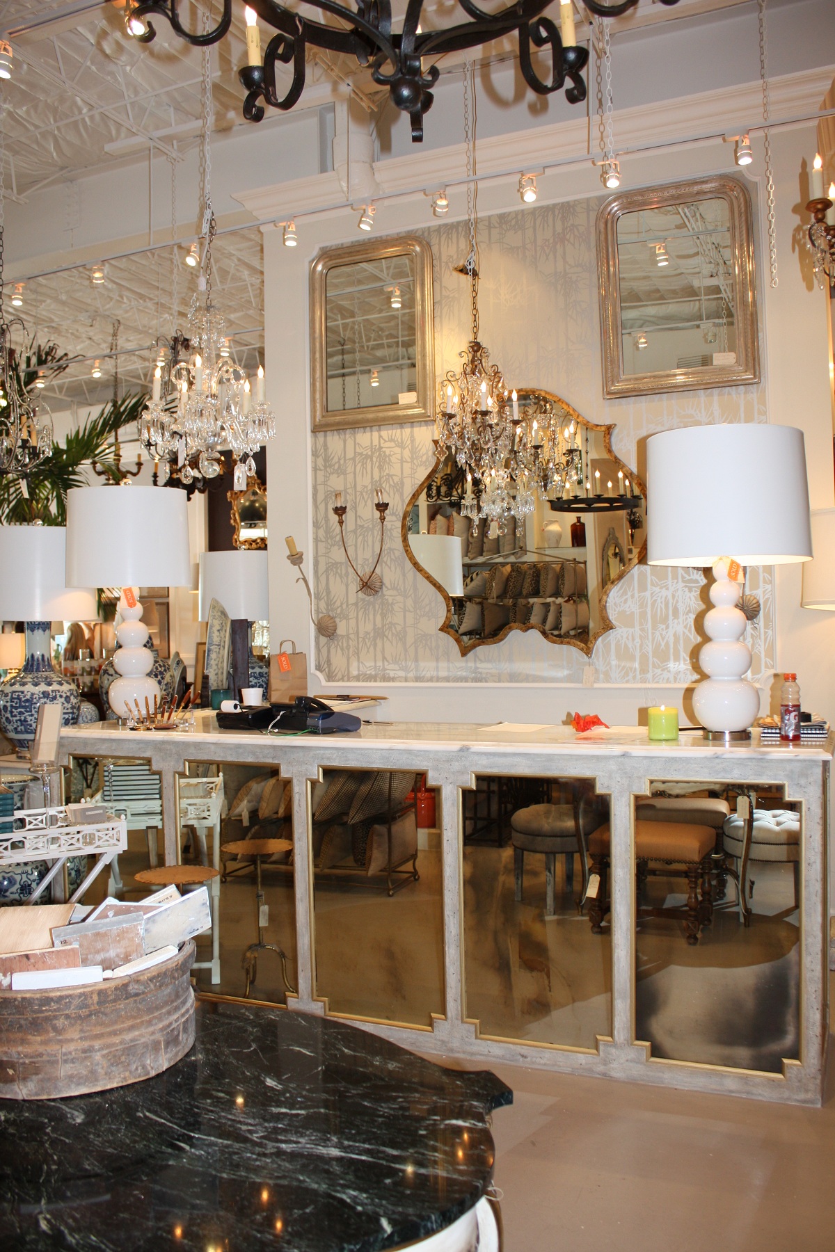 This counter at the front also has a wonderful design and finish– I can certainly imagine this look for so many furniture and wall applications!!! The mirrors in the front are wonderful too, reflecting the beautiful furniture throughout the store and opening up the space!!!