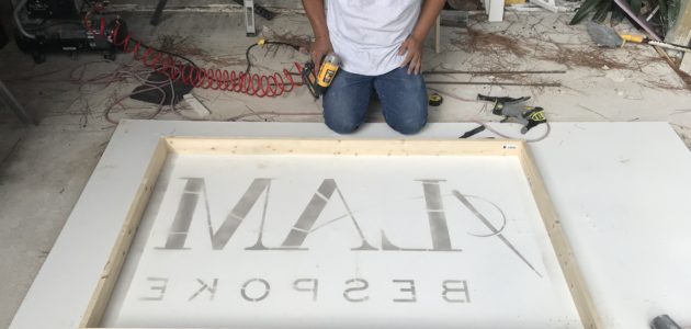 We decided to create the carved logo and inset it into the wall. The logo alone would weigh over 300 pounds. We re-created a stencil of their logo, sprayed it for placement and then used a laser cuter to cut the same logo out of Styrofoam to use for our mold.