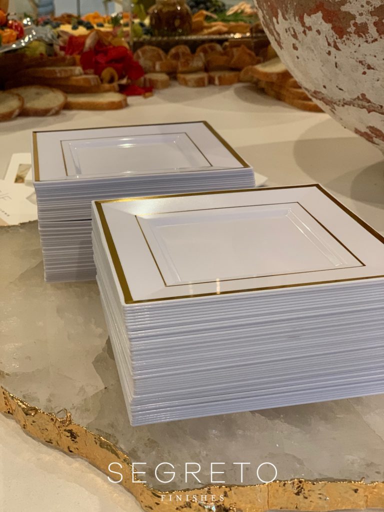 These china feeling plastic plates, ordered from Amazon, were placed on an onyx slab trimmed in real gold leaf.
