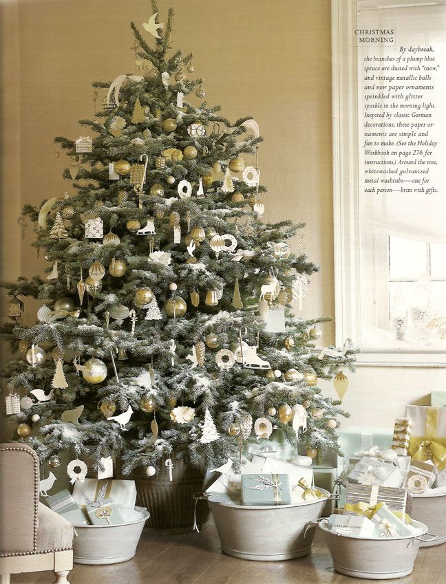 I love this tree for so many reasons! Foregoing the traditional stand and skirt, the pot the tree is planted in becomes a design feature! The ‘frosted’ branches (DIY for less than $10 here!) and use of limited colors looks so vintage. My favorite part? Storing the gifts in these cute metal tubs; keeping them off of the floor and organized by recipient!!!