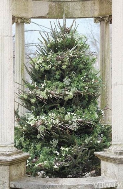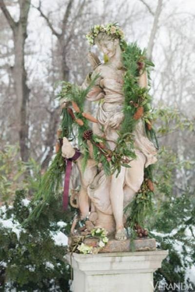 Such splendor in this statue draped in cedar and pine boughs with pine cones and ribbon. This year, I will keep in mind the advice of Emily Thompson, flower designer of the above,“Everything is so maxi-malist at the holidays, there’s beauty in being pared down.”
