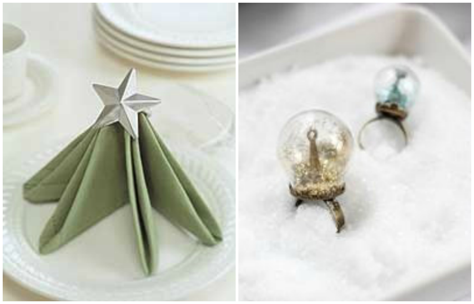 I absolutely adore these standing napkin trees! Topped instead with a handmade snow globe ring (tutorial here!) and you have a table setting and favor sure to impress your guests!! So cute!!!