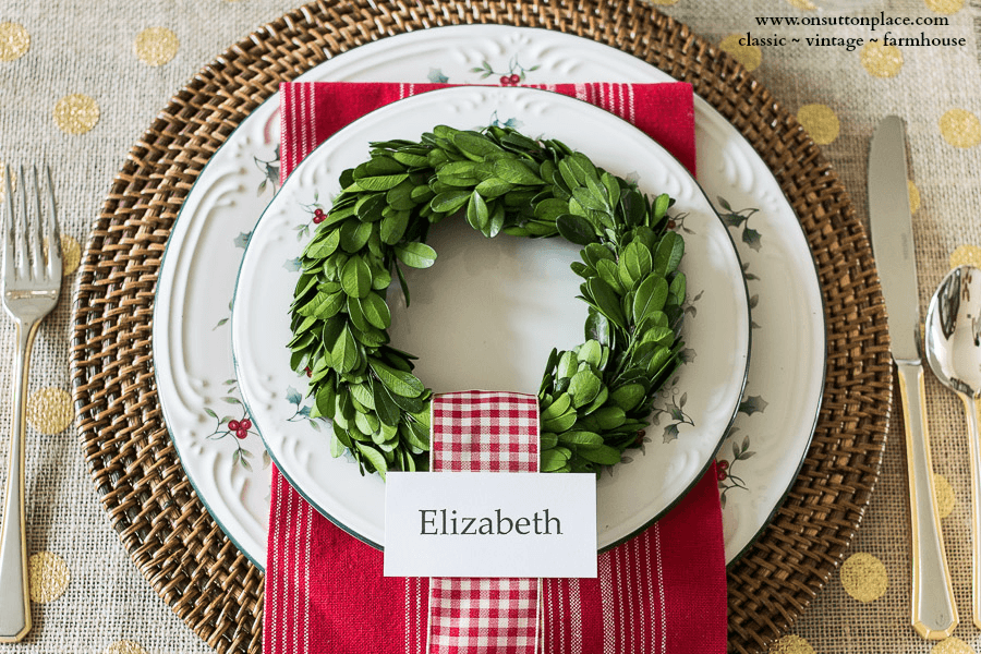 A beautiful example in layering, this place setting begins with a natural rattan charger. The colored napkin, folded into a rectangle, adds a pop of color between the salad and dinner plates while a petite boxwood wreath completes the stack. A pretty, coordinating ribbon holds the name tag and welcomes guests to the seat they’ll look forward to having!