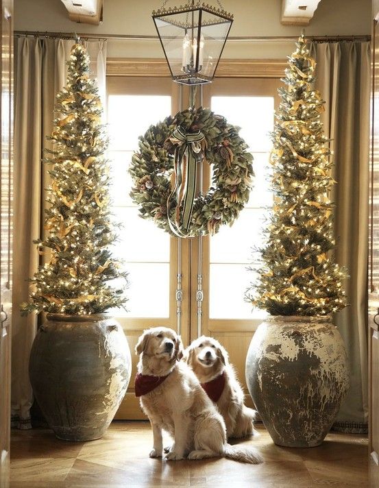 What a beautiful impression these potted Christmas trees make in these antique French Biot jars! Any pot placed just inside an entry or flanking veranda doors with tall, slender spruce trees would be stunning!!