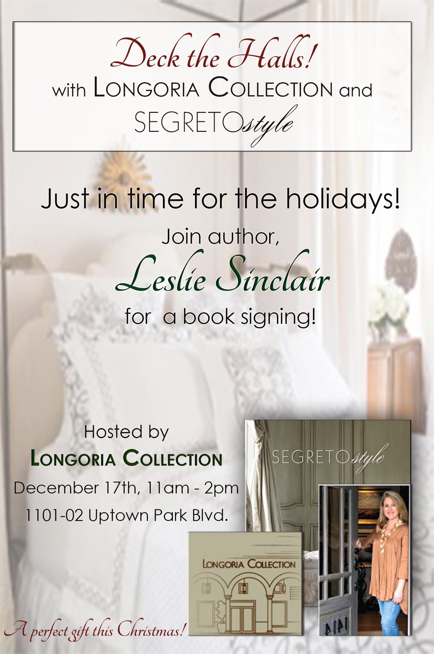 For your last minute holiday buys, spend the afternoon at Longoria Collection December 17th! I will be signing copies of Segreto Style from 11am to 2pm and admiring all of their amazing home and beauty selections! I hope to see you there!