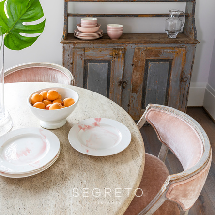 This room makes me happy just looking at it. The blush tones, dishware, warm woods and exceptional styling all work together to create something so appealing. Photographed by Julie Soefer, built by Elron Construction and designed by Dodson Interiors, this home will be in Segreto Impressions due to be released this fall. Beautiful? You tell me!