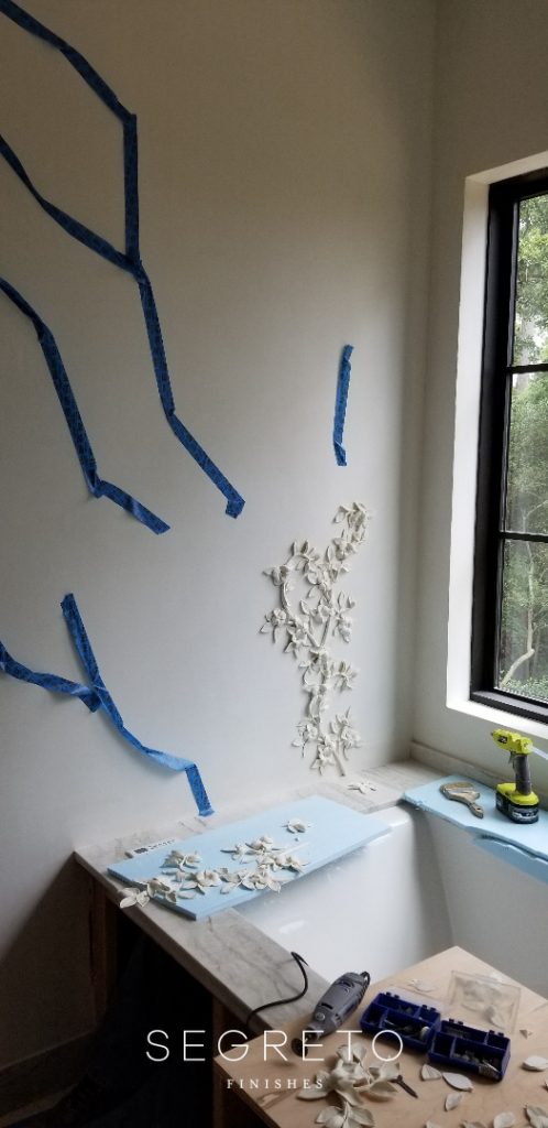 We used the tape to map out the flow of the design as we did not want to mark on our freshly plastered walls. Here is a snippet of the beginning of the design. I will let Marie’s group post the finished installation once the room is cleaned and fluffed!! Beautiful? I think so.
