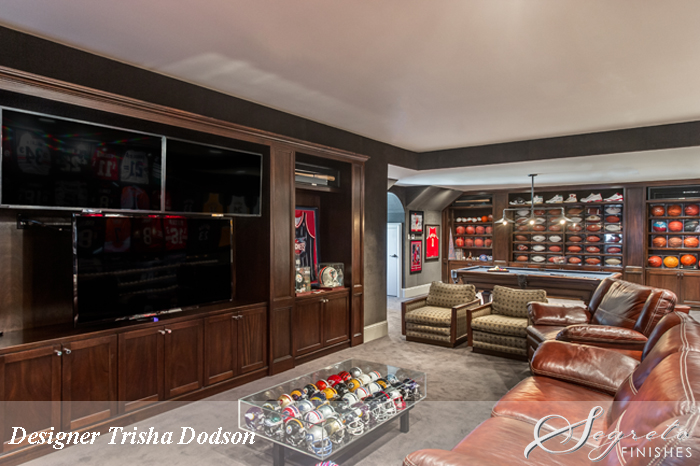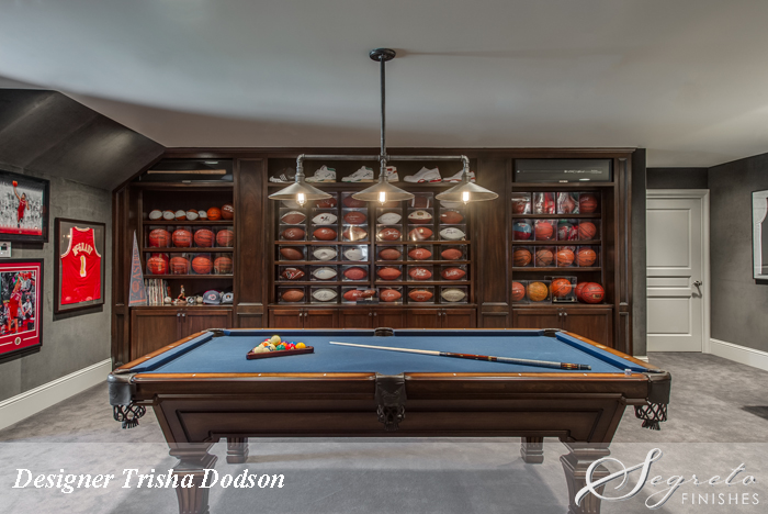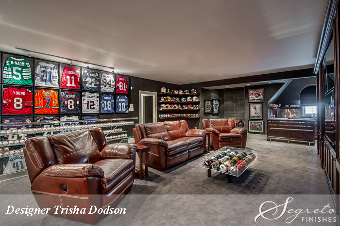 This is an amazing man cave housed on the third floor of a home that we just completed! So much thought was put into how to house each item for this avid sports collector.