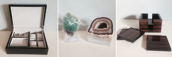 Tizo watch box $225, Mounted Minerals (left $175, right $340), wood coasters $105