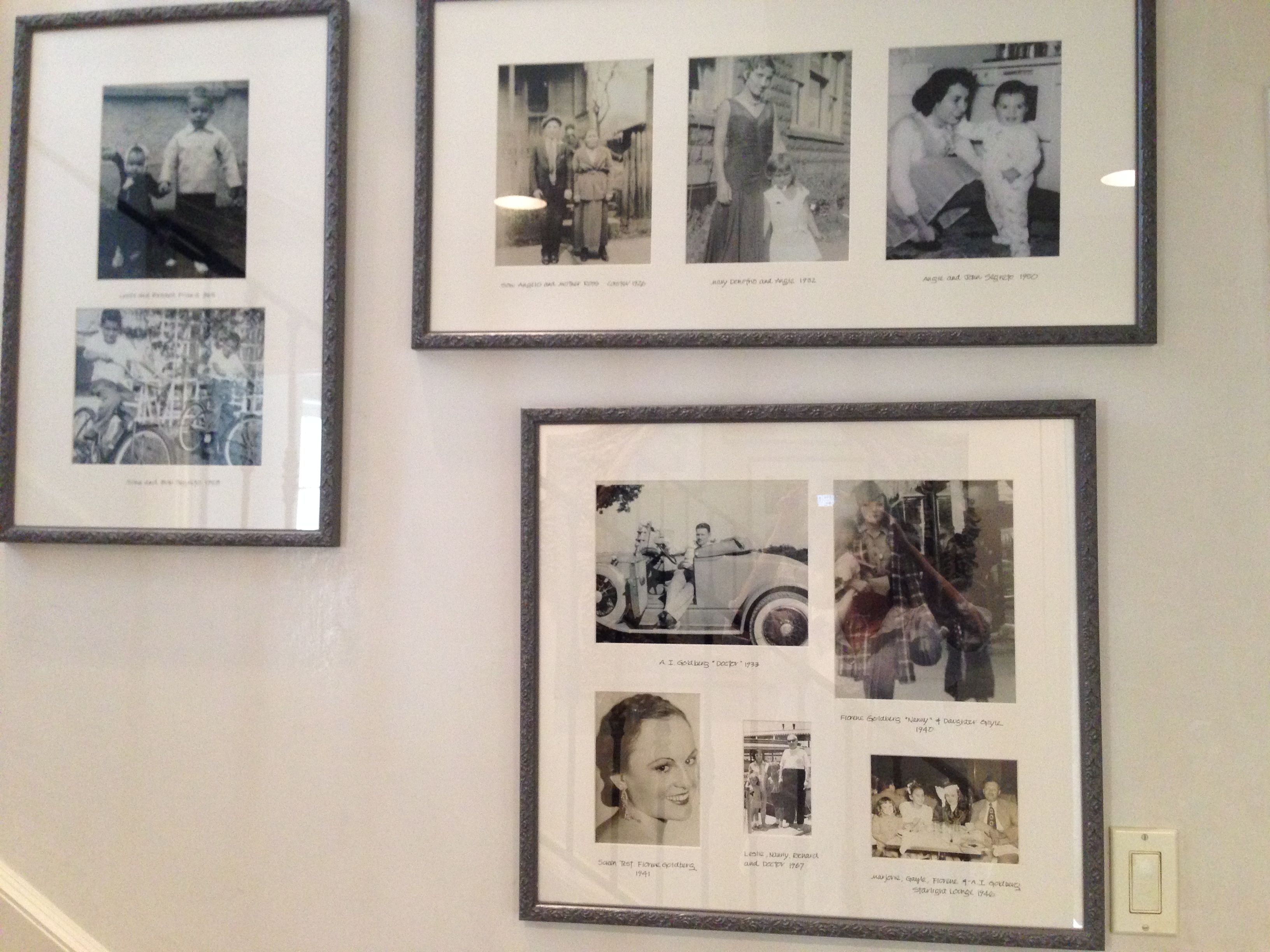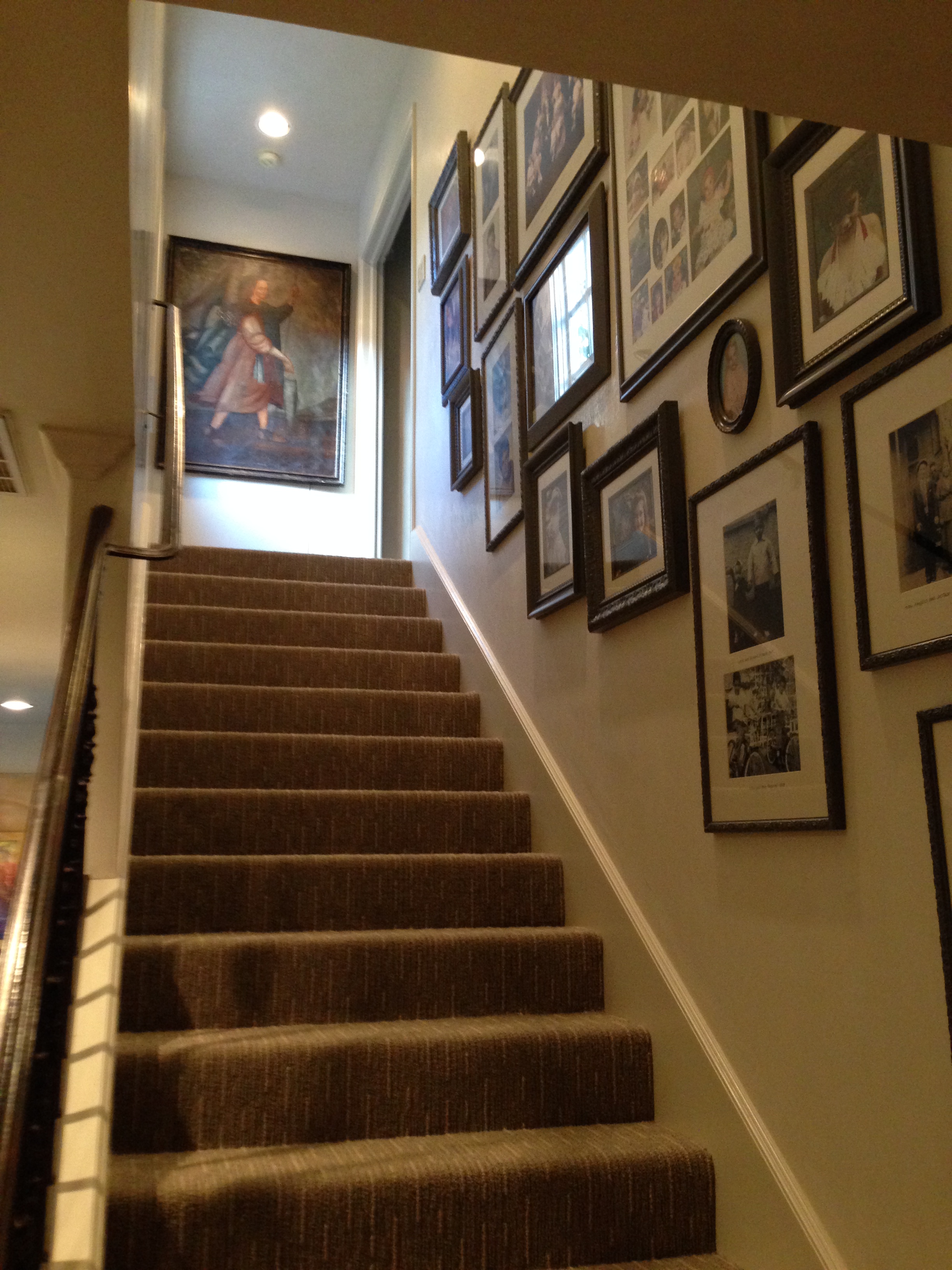 For our new look, I decided to simplify and use framed photos going only up the staircase, so … John and I had to edit!! We selected about 20 frames portraying our kids, my parents as children, and even a 1927 wedding portrait of John’s Italian family (named Segreto!)!
