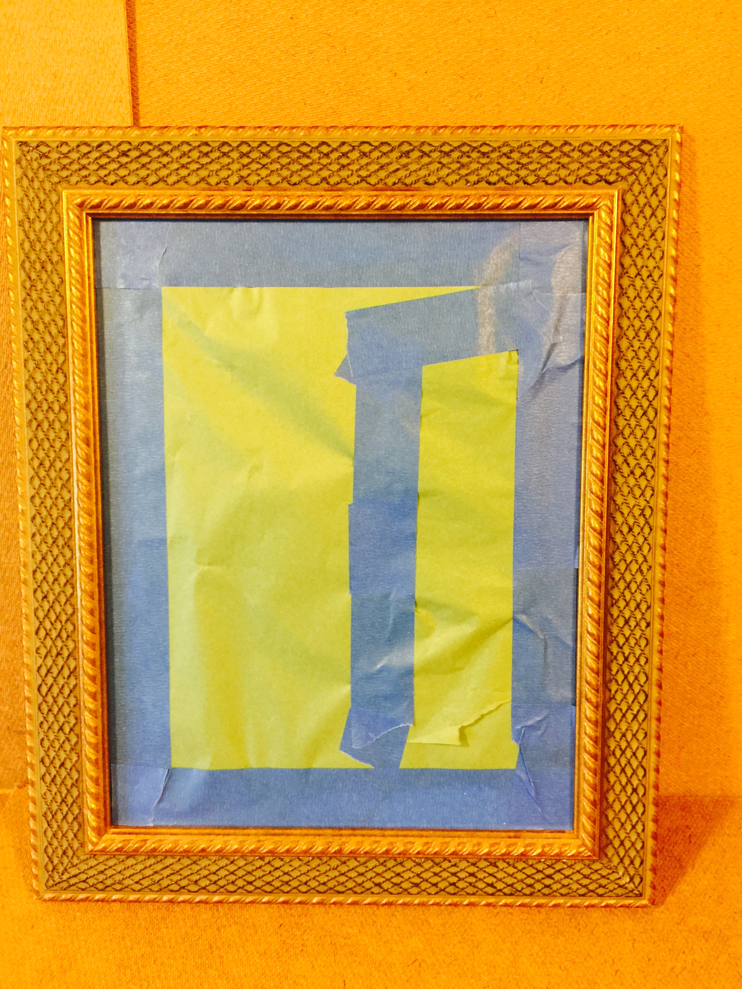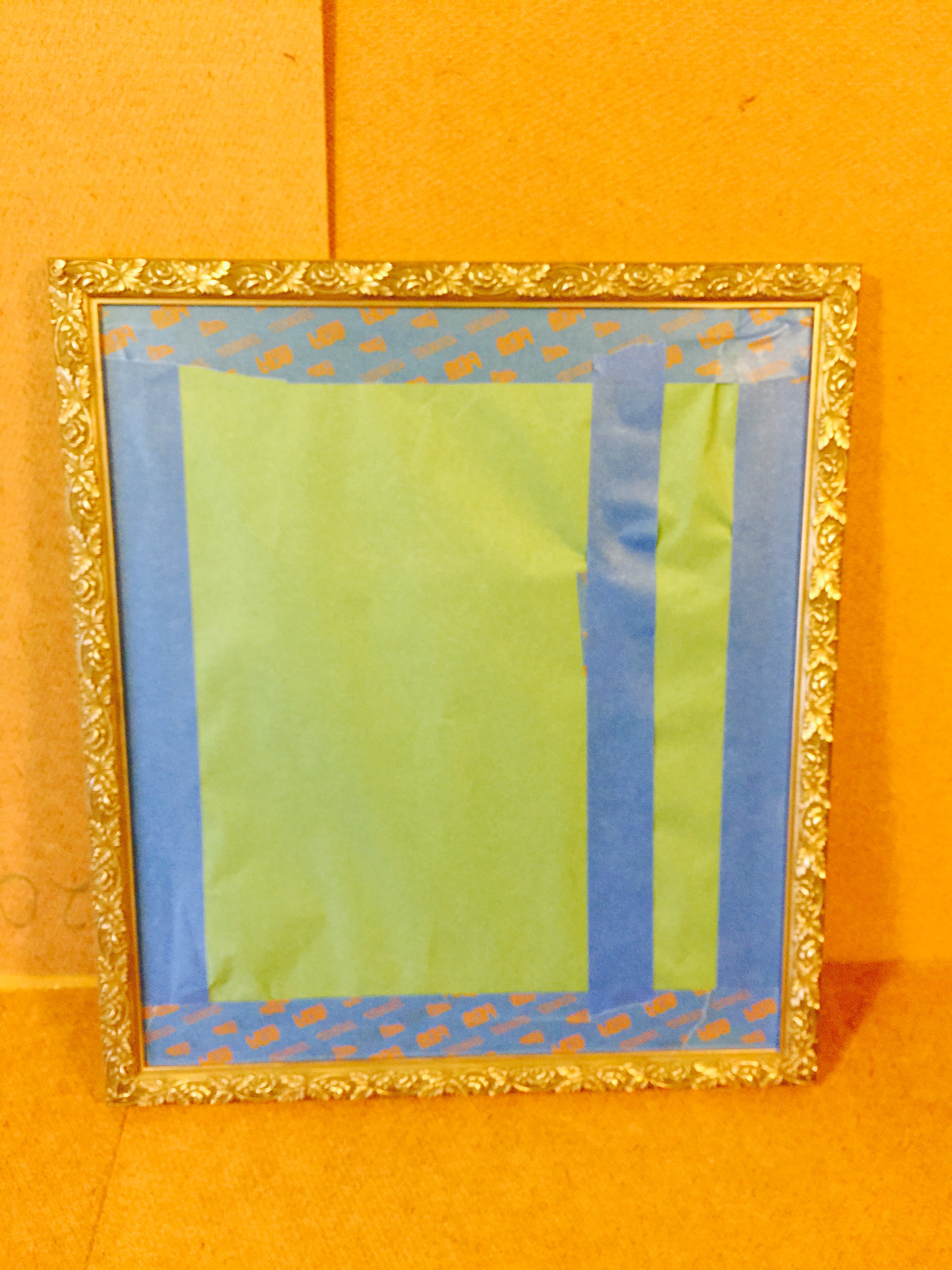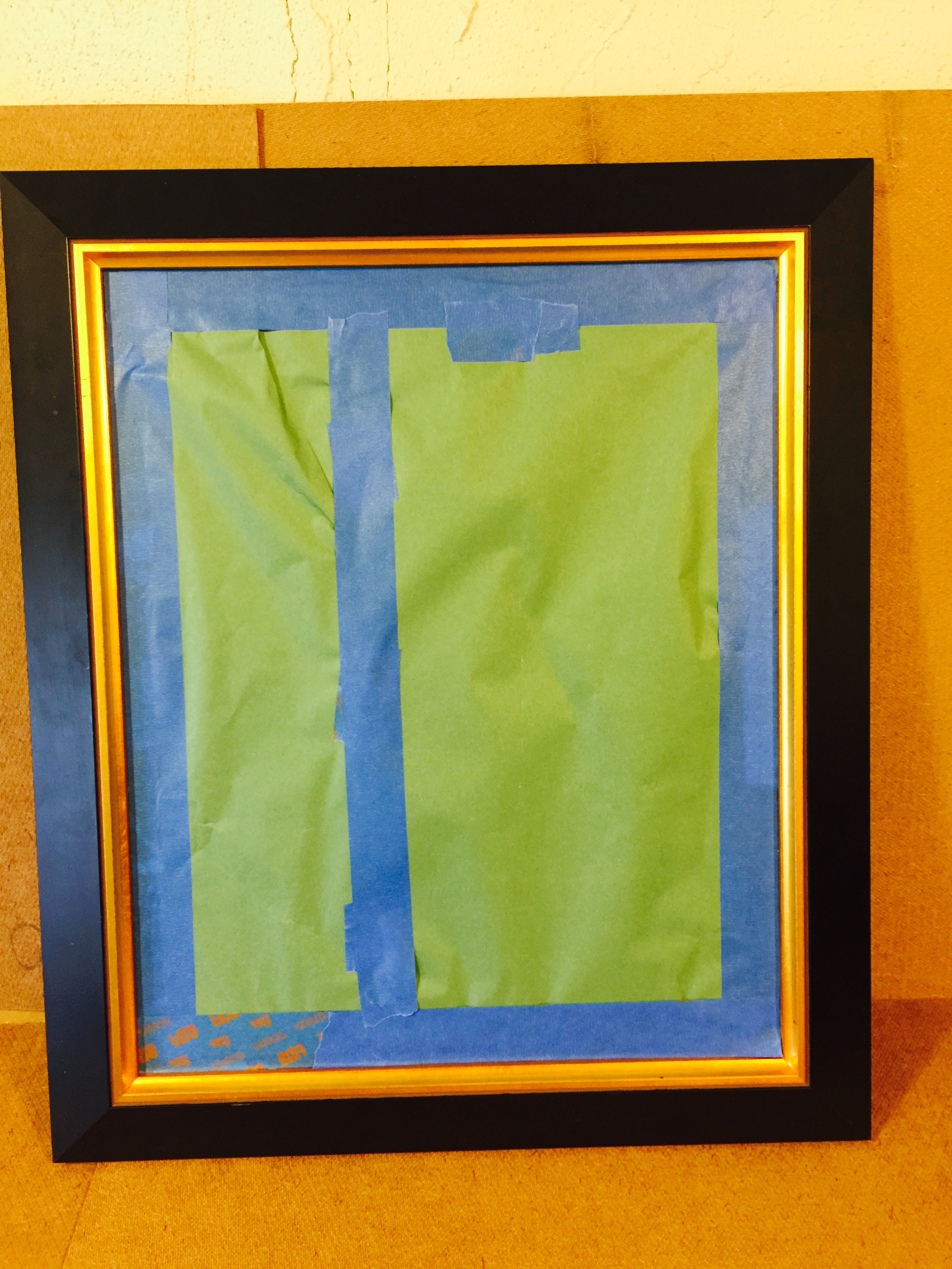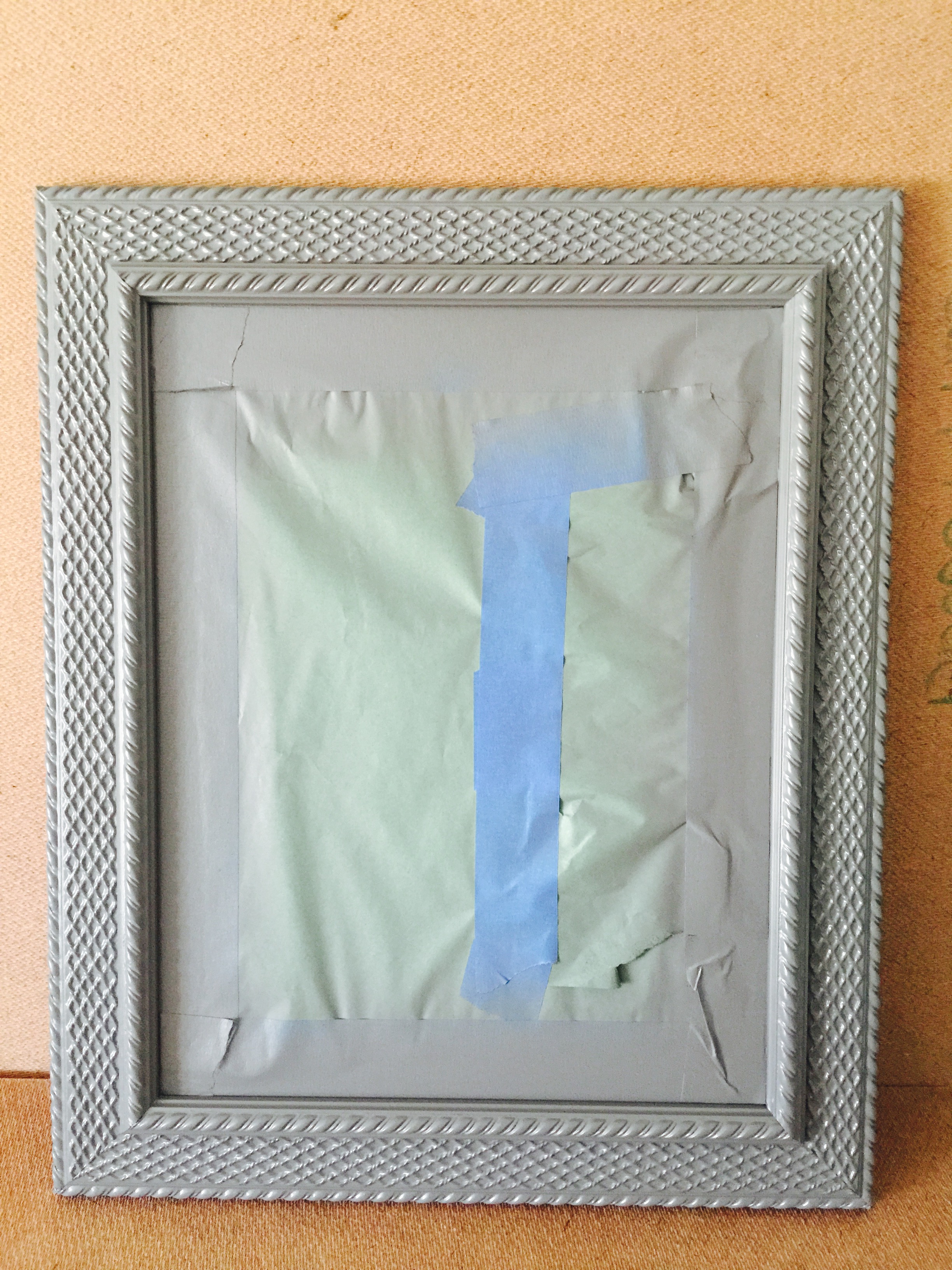 I taped paper to the glass to protect it, making sure I was spray painting only the frames. These gold and gold/black frames are about to be a unified gray! Spray one coat. Let it dry. Spray again.