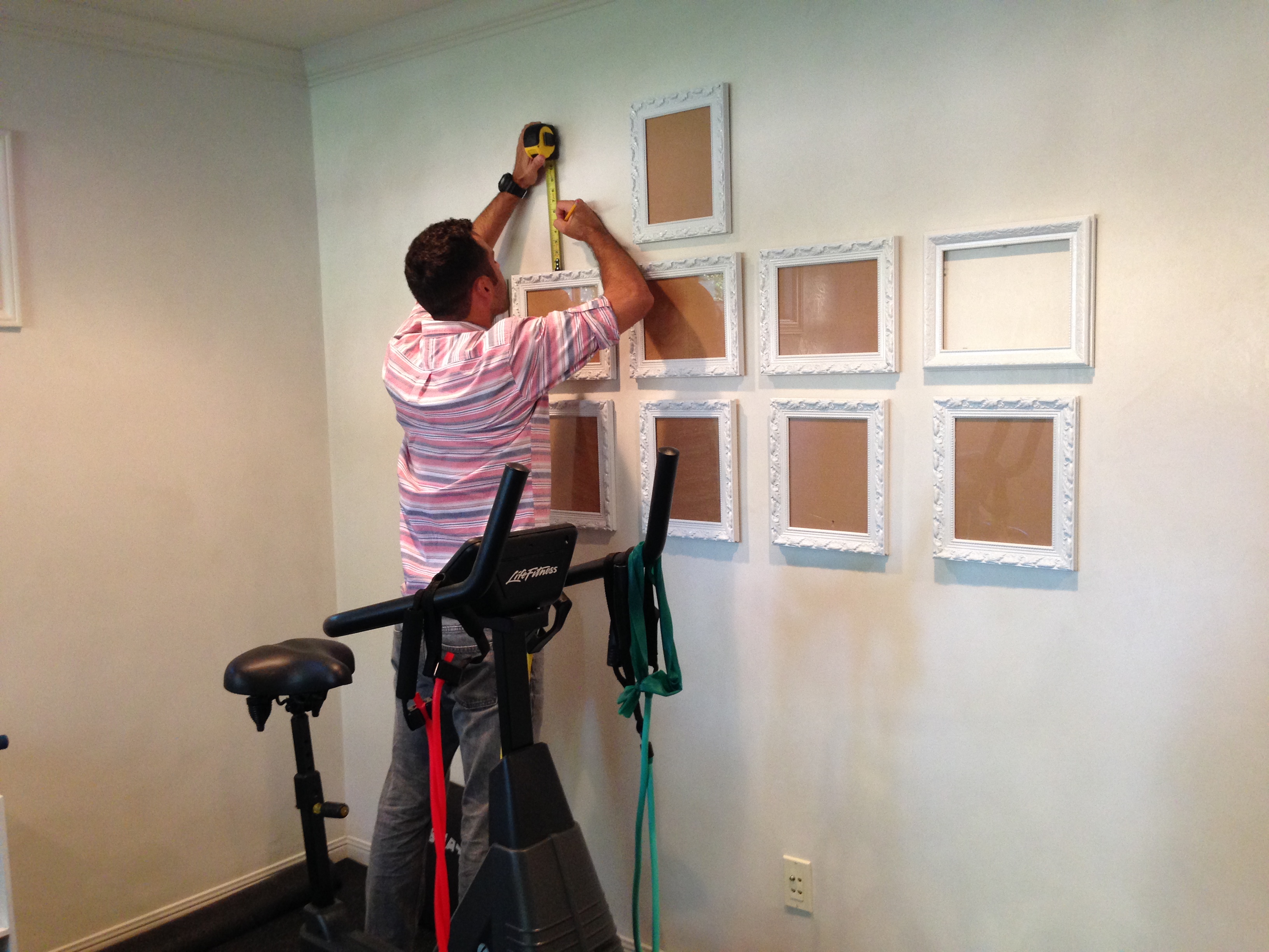 PS. I also spray painted more old family photo frames in a high gloss white and Isai was there to hang them in our exercise room! However, the painterly perfectionist in me thinks the white needs to contrast a little more with the walls — maybe a fun pop color…. I will let you know what I decide!!