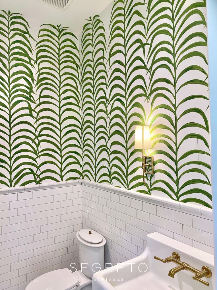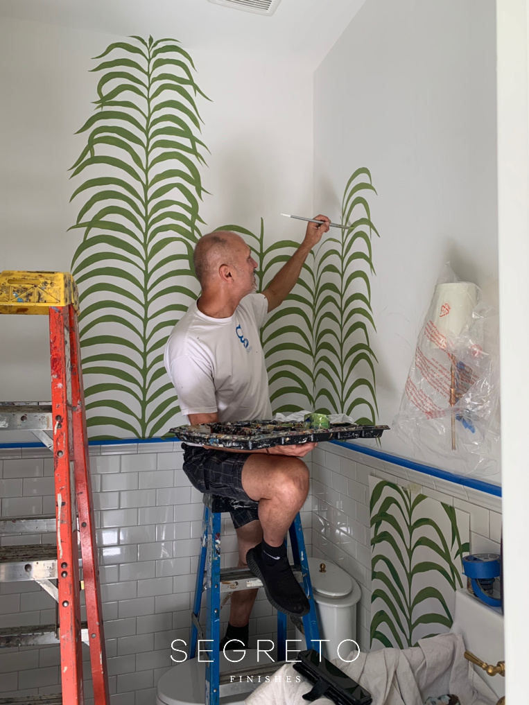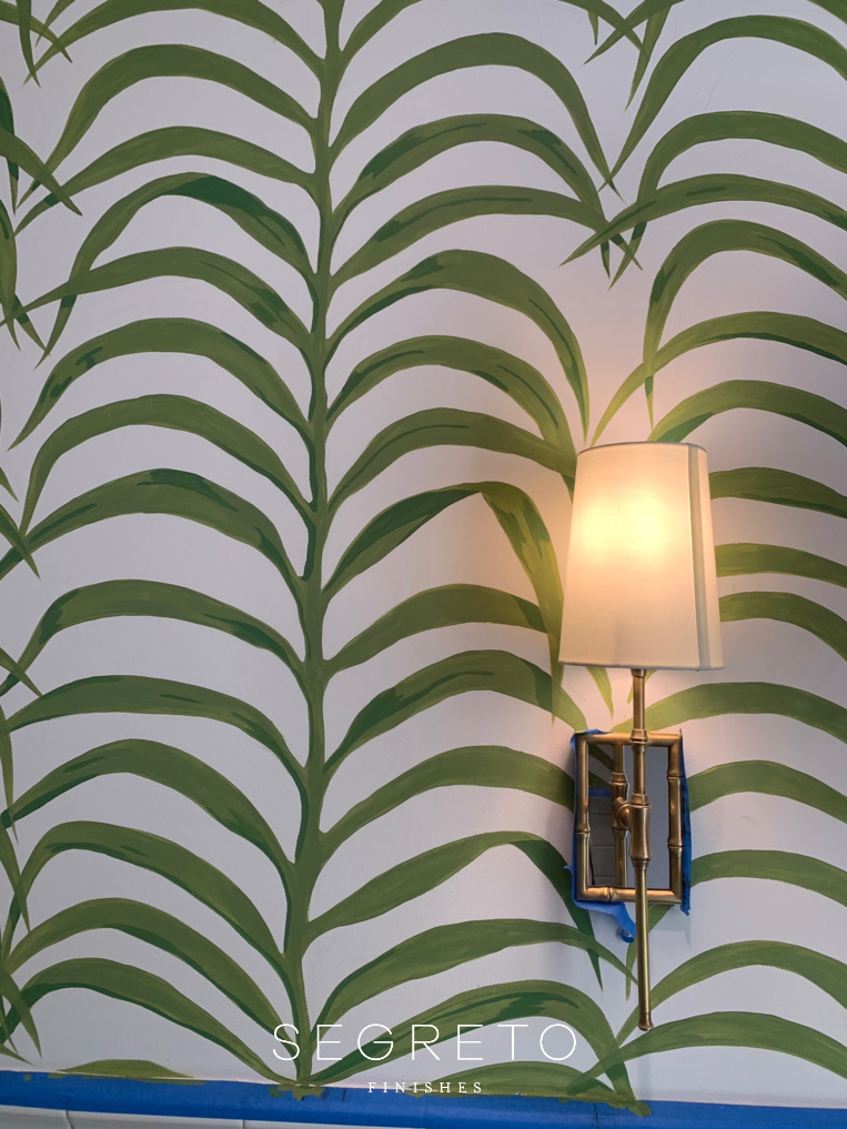Rather than have each palm the same scale, we were able to alter each ones size to line up the corners perfectly. Notice a bit at the top grazing the ceiling? This detail is the beauty of having a treatment hand-painted rather than using a structured paper in the space.