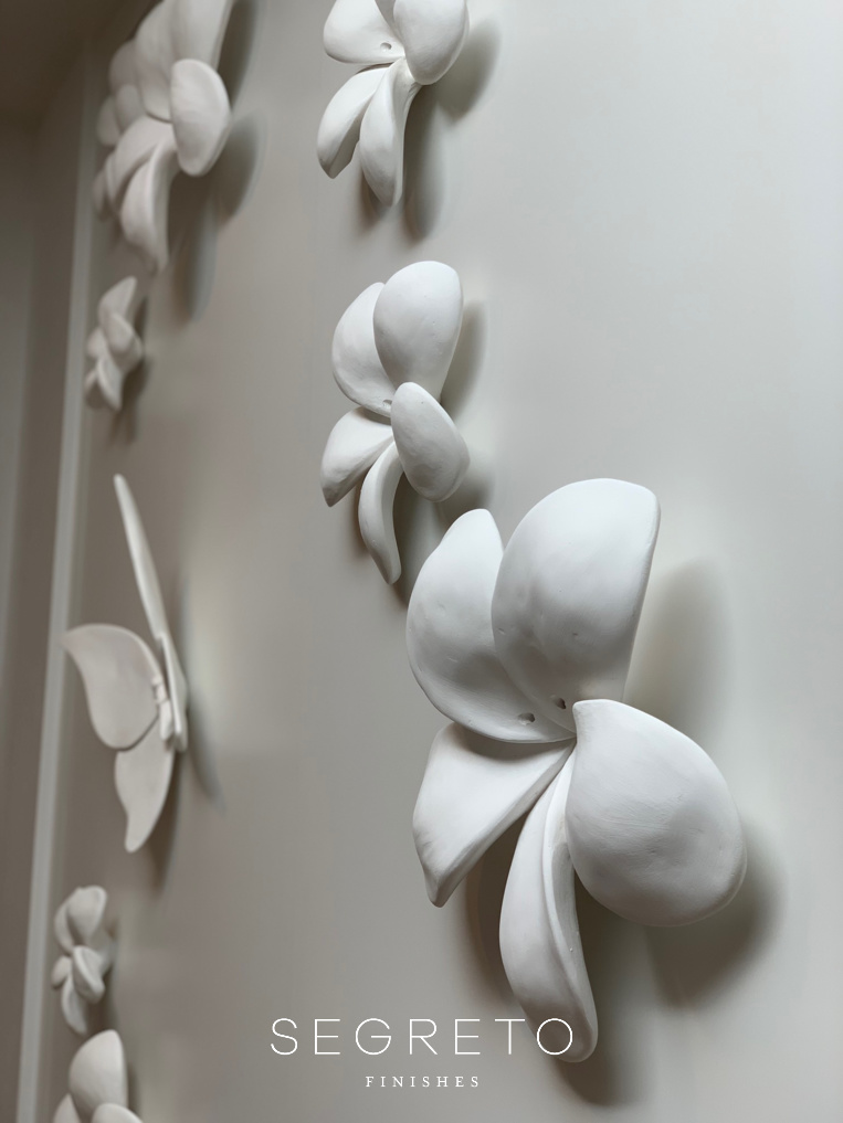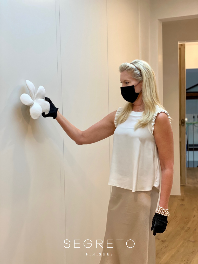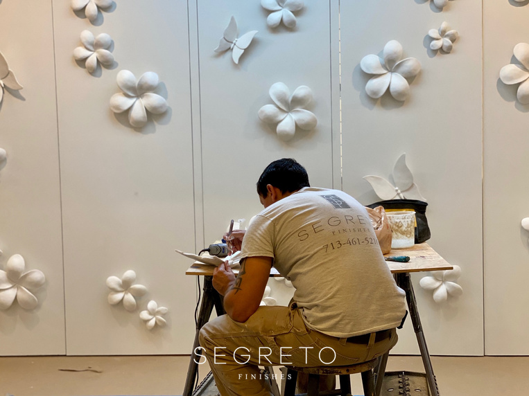 Architectural Consultant, Sarah West (who is rocking that mask) always knows how to challenge our team. Her vision for this upstairs wall of storage was to disguise the wooden doors by transforming them into art. Sarah sketched florals and butterflies as inspiration from which our team created three dimensional art pieces from plaster.