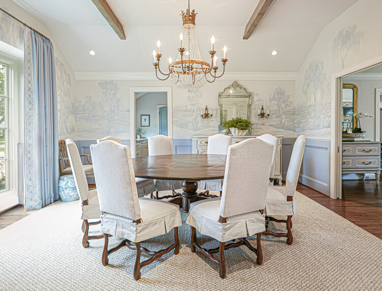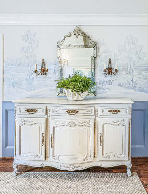 This gorgeous dining room was so fun for our team to collaborate with for designer, Molly Solich and photographed by Allyson Huntsman! The homeowner, from Louisiana, had long wanted a beautiful and moody swamp scene for this room. To keep it contemporary, we stayed with the tone on tone. The hand-painting includes moss covered cypress trees and herons hidden throughout the landscape.