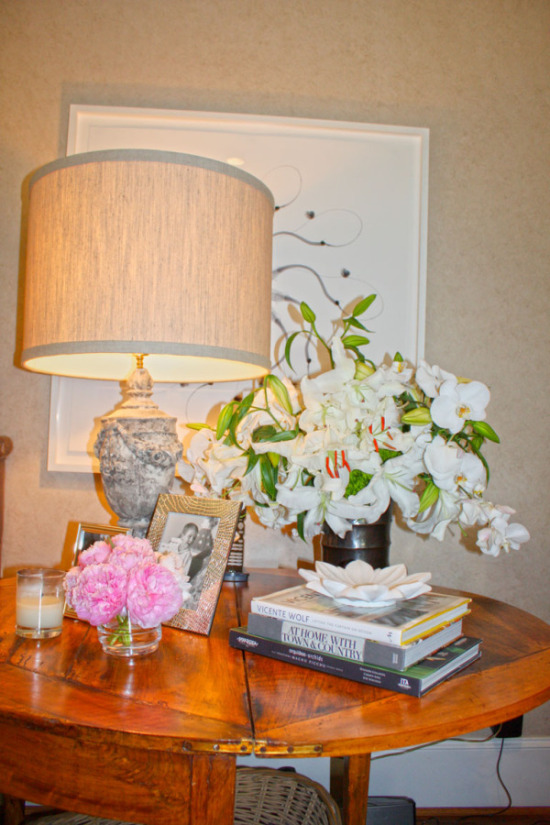 Regina and Janet started Twins Design in 1989. While they now work independently – Regina at Twins Design Christmas and Janet at Janet Gust, Interiors – they collaborate on several different jobs with Regina focusing on the holiday design and Janet on the interiors. I love seeing how passionate they both are for their work, and it definitely comes through in the design, as this entryway scene reveals. The fresh flowers draw out the tones in the pillows and the clear bottles and candlesticks bring a clean and airy feel echoing the open floor plan. This area stays sophisticated with its Springtime flair by making the floral the main decoration.
