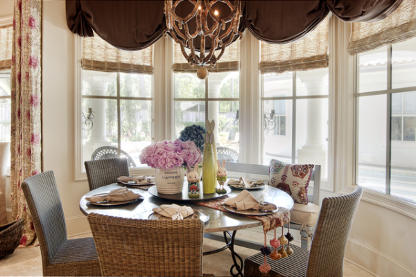 Calling holiday decorating the “icing on the cake,” Regina integrated fun floral and rabbit decorations in this dining room to play off the whimsical vibe offered by the hand-painted trees on the walls. Bringing a bit of blue in with the pinks, this Easter scape is so colorful and cheery. Regina always tries to bring her clients’ personalities into her designs, and she definitely picked up on homeowner Stephanie’s upbeat personality and vivaciousness. As Regina explained, “Color was not a problem in this house… Stephanie loves life and lives each day to the fullest.” These bunny decorations certainly reflect that sense of fun!