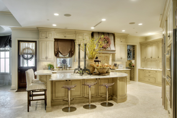 I love the eclectic mix of elements in this kitchen – the different types of barstools, large candleholders, stunning range hood, cabinetry we finished to accents its furniture lines – It all works together really well! To keep from interfering with the basic functionality of the kitchen, festive accessories were kept to a minimum here with the exception of the wonderful wreath adorning the range hood.
