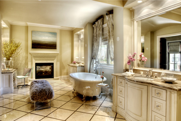 The flower touches are continued in this elegant master bath. This room blends together effortlessly, with the clean lines on the cabinetry to echo the floor and the modern chair offset by the claw foot tub. I just love the fuzzy bench that Janet lended to bring in the same whimsical spirit from the rest of the home!