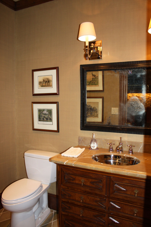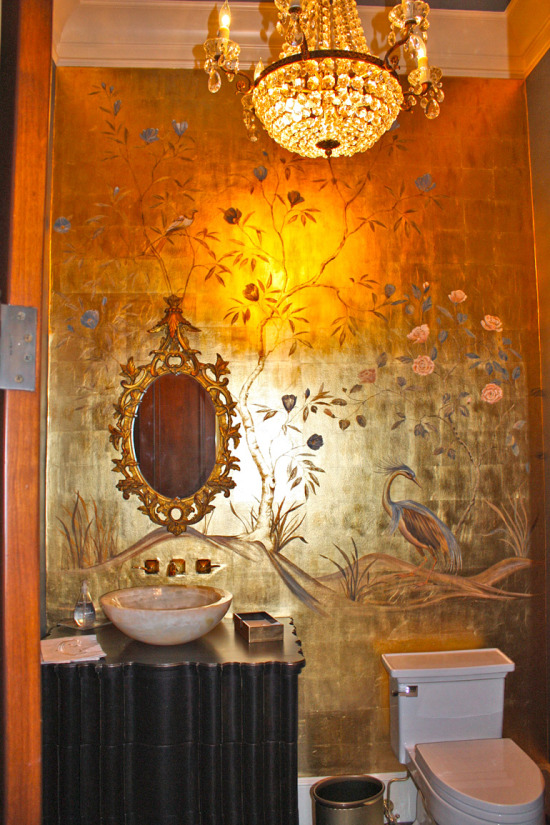 The ornate powder room is a lovely example of the influence that living abroad in the far east had on Tracy’s design style. Gold leafing and painting a Gracie-inspired design on one wall develops an original focal point that pays homage to Tracy’s love of art. The remaining walls were matched to the blue-gray flowers in the mural.