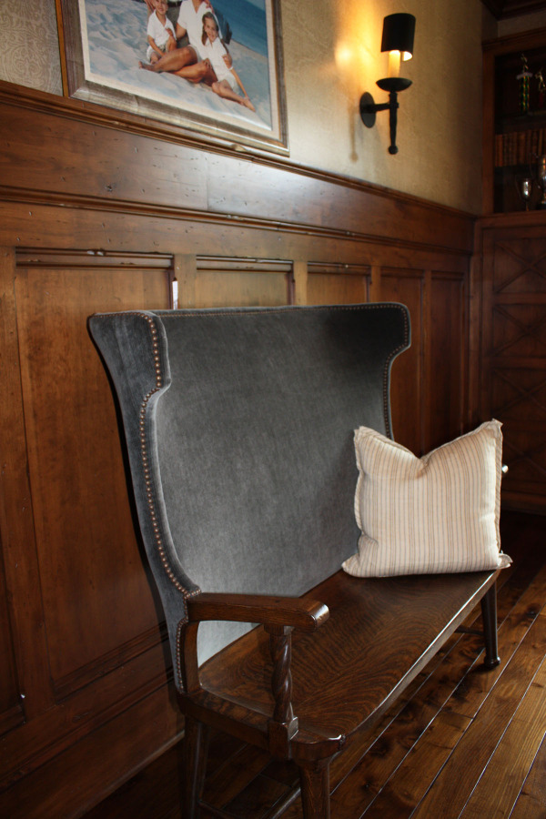 Adding to the English pub atmosphere, Cindy found this really wonderful bench and made it even more unique with blue velvet upholstery on the back.