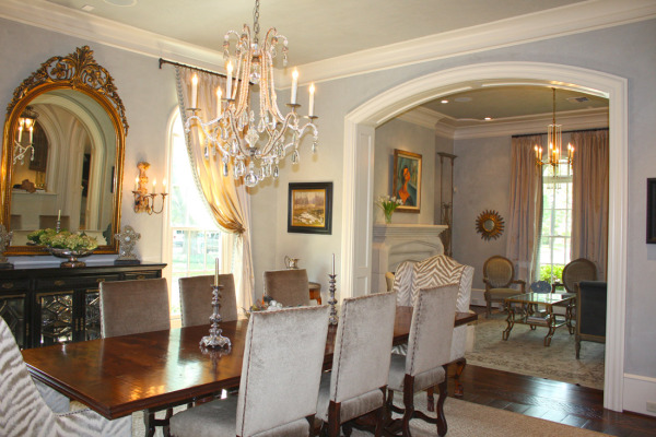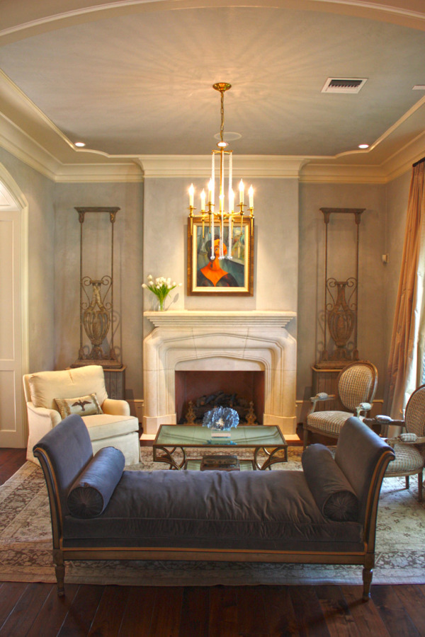 The living room posed a bit of a challenge because it is not a large room, yet its positioning within the house makes it so very important to the overall feel of the home. When Cindy took over the project, they tried to work in the gorgeous, custom silk sofa made for Tracy’s last household, but as hard as they tried, it was just too big for the room and blocked the beautiful fireplace. The new daybed was a better solution for the space, allowing one to see across the room without any obstruction. I love the subtle variations in texture – the fabulous, ball gown-like curtains have a handmade trim while the two French chairs are upholstered in a painted velvet that Cindy had been dying to use for years. The “urns” flanking the fireplace are really pieces of folk art created with pressed paper that has an amazing texture and painted finish. The chandelier was the last thing Cindy and Tracy purchased for the room – it feels like a piece of jewelry hanging from the ceiling.