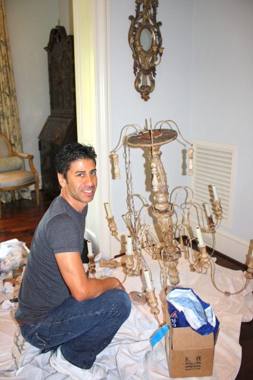 And here’s Jerry now, working on our next project – the master bedroom. Adding some cool blue tones, Jerry is aging this lovely chandelier so that it complements the chosen fabrics for this room. I just can’t wait to see how Cindy and Tracy complete the project! Hope everyone has a great week and congratulations to all those graduating seniors!!