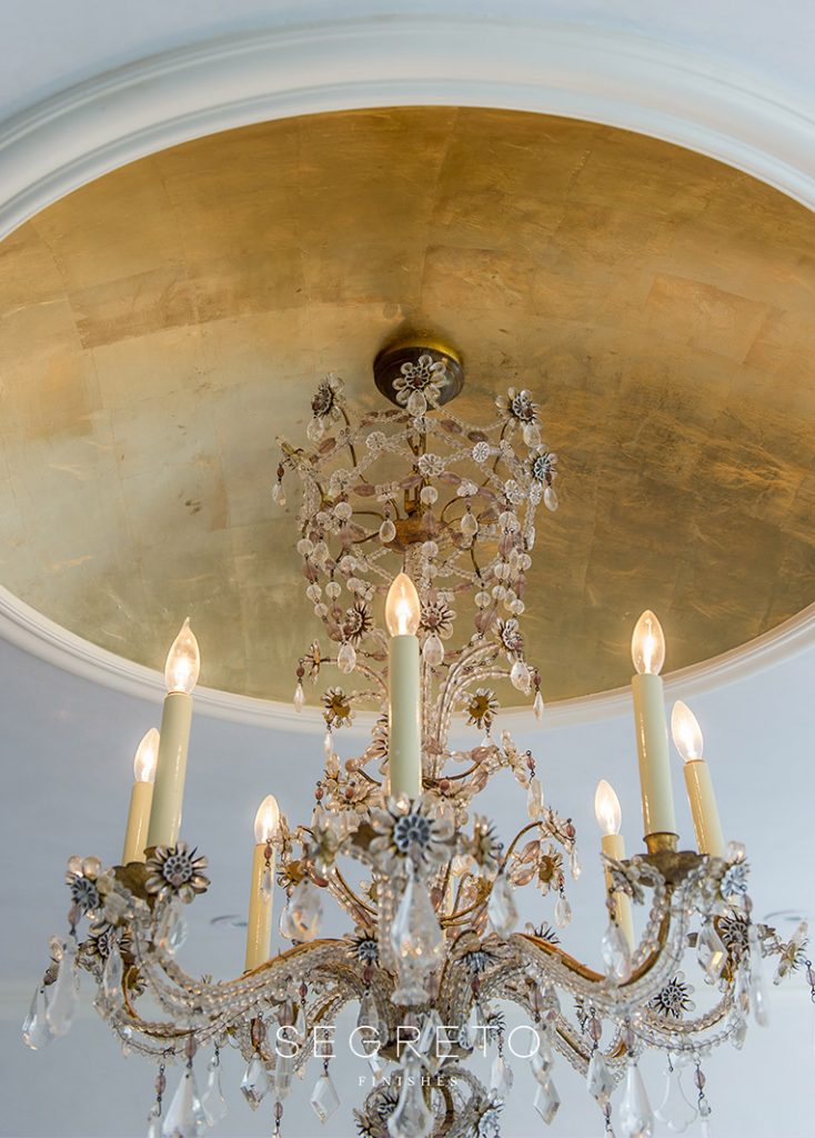 Metallic is being widely used today to bring a bit of 1920s Hollywood glitz and create jewel-box accents on cabinetry, shimmering effects in dining spaces, and subtle, silk-like glows in master retreats. Unlike the heavy, gilded look of yesteryear, these new metallic are incorporated sparingly for elegant, captivating spaces. Gold, white gold and silver, hammered into extremely thin, square sheets, are excellent decorative tools for leafing ceilings or gilding furniture. Applying metallic to range hoods can create a metal look at a fraction of the price of customizing a stainless, enamel or brass one.