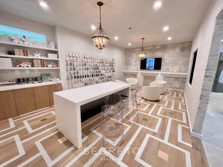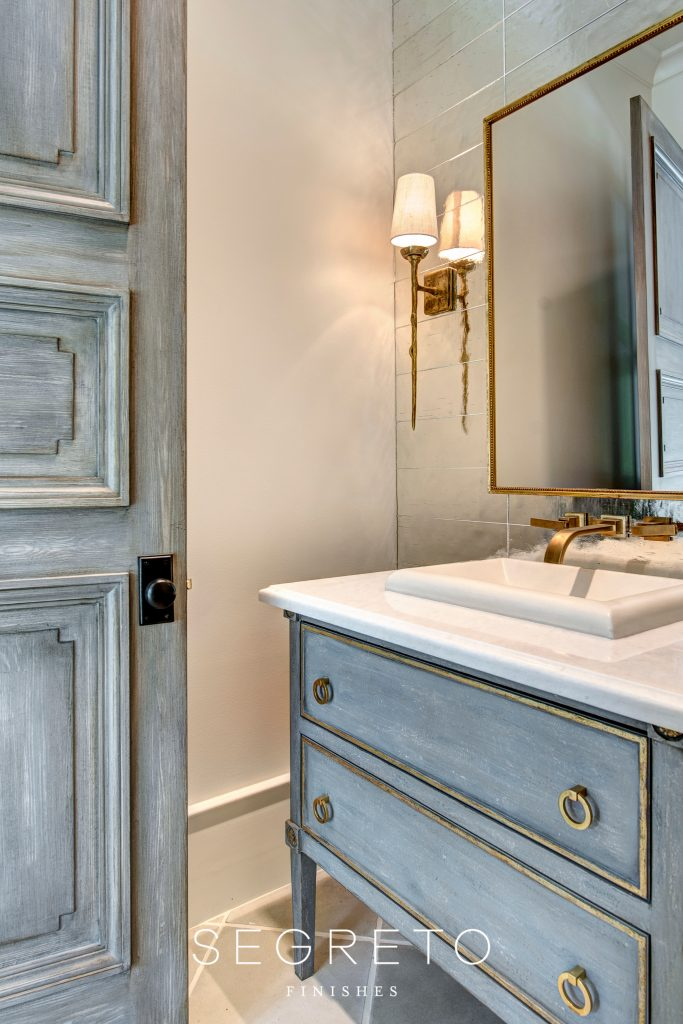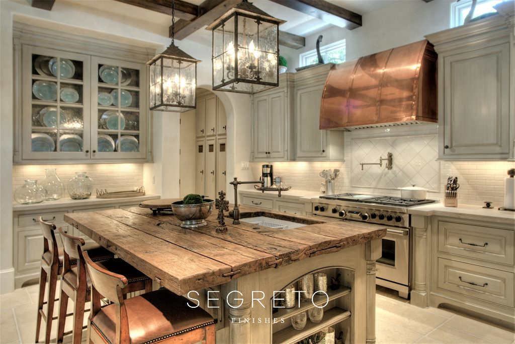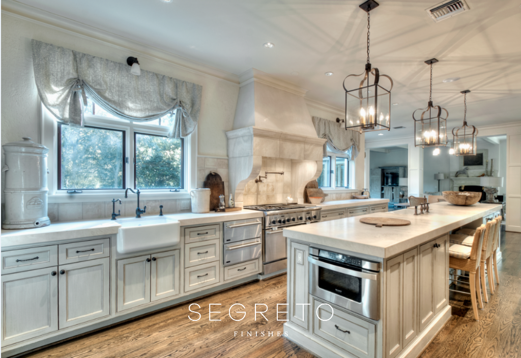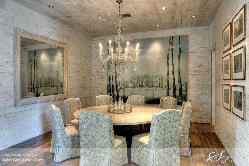 With today’s open floorplans, often time’s wall finishes remain consistent while built-in cabinetry, paneling, beams and doors give each room that unique element. Quality wood finishes transform raw wood or painted pieces into reclaimed elements; they reinvent sprayed cabinetry into sleek furniture with chic gold or silver detailing; they can even turn a standard planked wood ceiling into repurposed barn wood, or a heavily stained orange wood cabinetry into an aged grayed limed finish. Cabinet finishes show dirt less and hold up much better than simply painted ones since we seal them with an acrylic floor sealer which is washable and will not yellow over time Not only can these treatments greatly enhance a new construction, but they also can reinvent a home’s existing elements at a fraction of the cost of ripping out and building anew.