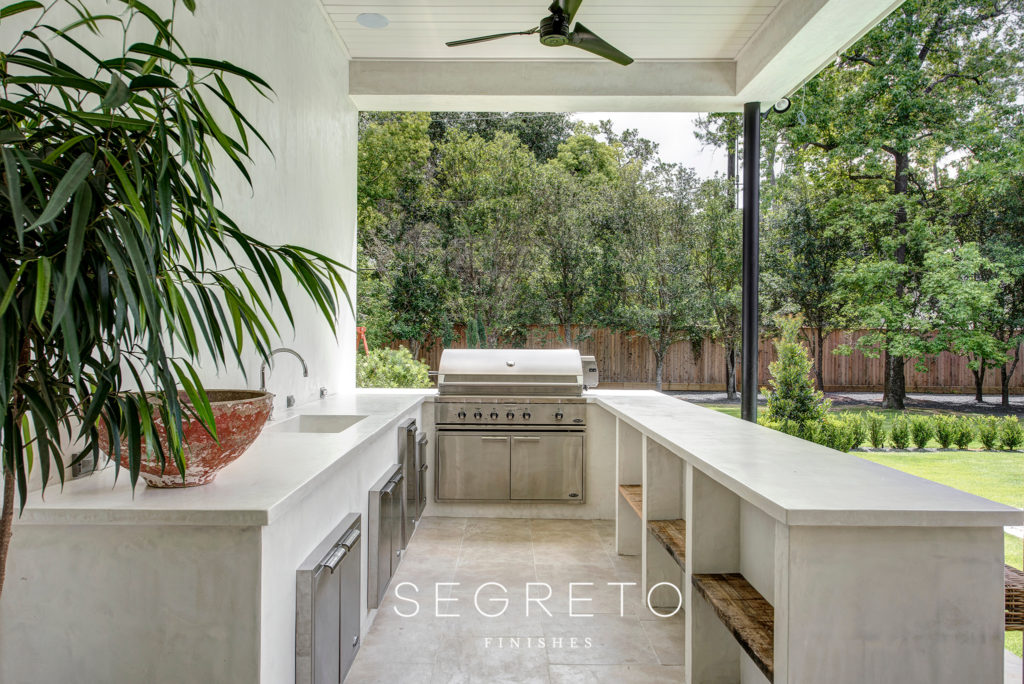 After hearing of our new SegretoStone, James and Ashley put aside their previous natural stone selections.Β Wanting the reclaimed element to be showcased, they loved the natural, organic subtle feel of our new product.Β One of the advantages of SegretoStone is the large pieces can be poured in place meaning no seams!!Β We have partnered with Gunnells Concrete Designs, working together for our larger installations. His mastery of concrete and ours of plaster have been the perfect collaboration.